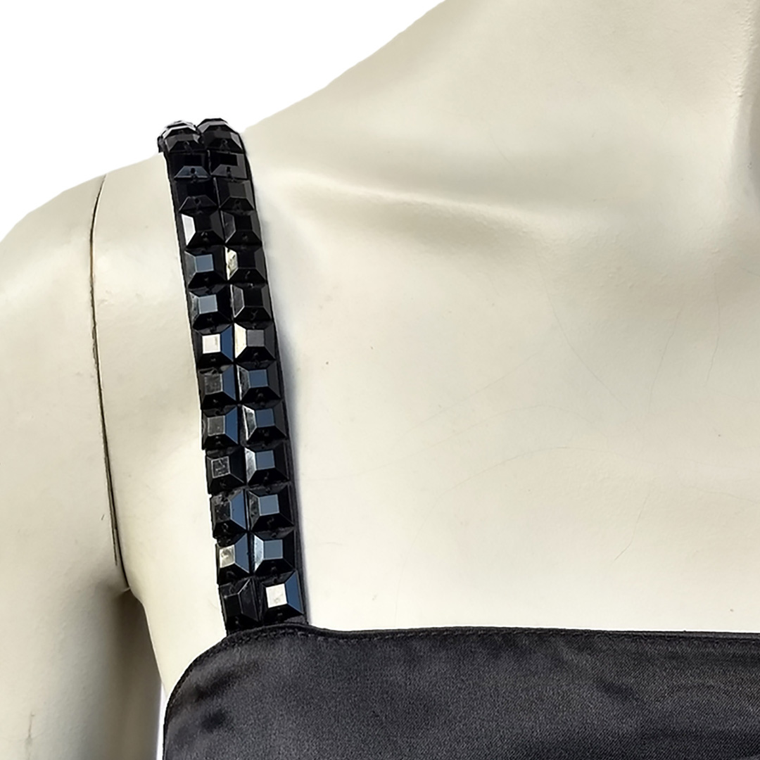 Breteles en satén bordado con tachas al tono.
