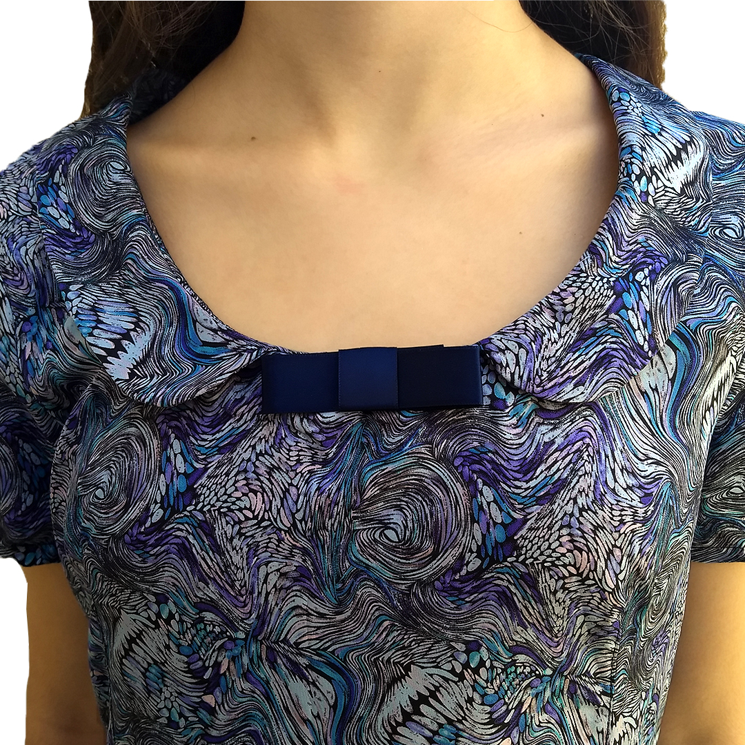 Detalle de moño en frente del escote y cuello baby.